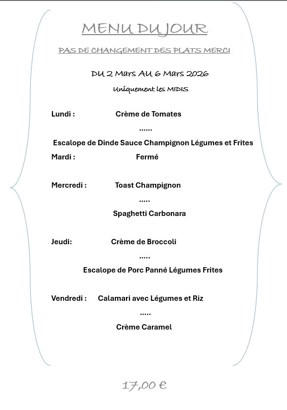 15 avril 2017 francis les différents menus sont vraiment très bon, personnel très aimable ainsi que le patron client depuis 2014, très bien aussi pour les livraisons, service rapide